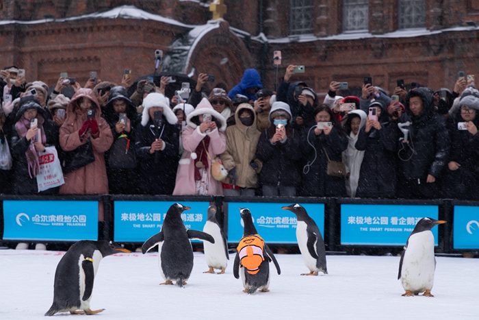 为助力“甜雪极梦社”全国首店落地,哈尔滨极地公园于1月16日在索菲亚广场与西城红场精心准备了企鹅冰雪巡游,品牌代言鹅“甜雪”“糯米”将首次外出打卡,以特别的冰雪热情迎接全国宾客。