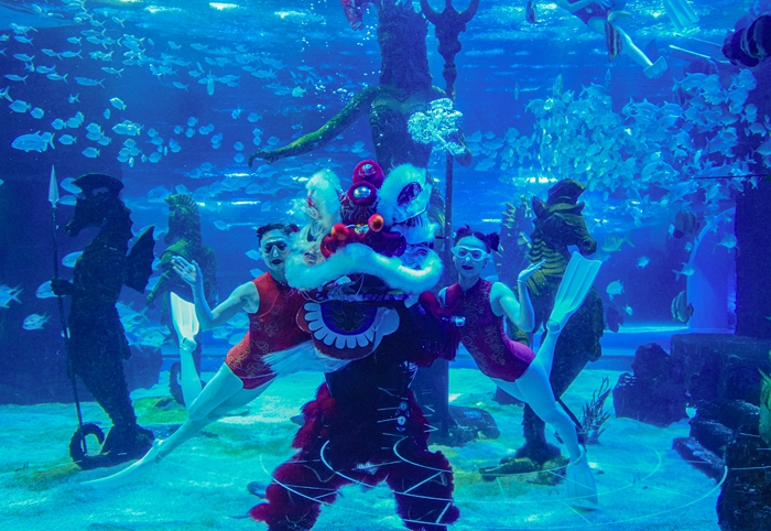 世界首创3D全息光影海豚秀解锁全新新年剧本,特邀国际歌唱家倾情献唱,打造如临演唱会现场的沉浸式视听享受;水舞秀惊喜推出海底舞狮新春限定版,表演者身着国风服饰在水下演绎传统舞狮,刚柔并济的动作将年味习俗与艺术美感完美融合。两大全新大型互动情景表演同步亮相,《冰川回声-新年舞会》集结国内外顶尖艺术家,异域风情歌舞轮番登台,带领游客沉浸式体验热闹的新年派对;《船长的新年宝藏》邀请游客与顶流极地NPC海盗船长趣味互动,解锁沉浸式玩乐新体验,让游客从观众变为深度参与者,尽享新春互动乐趣。