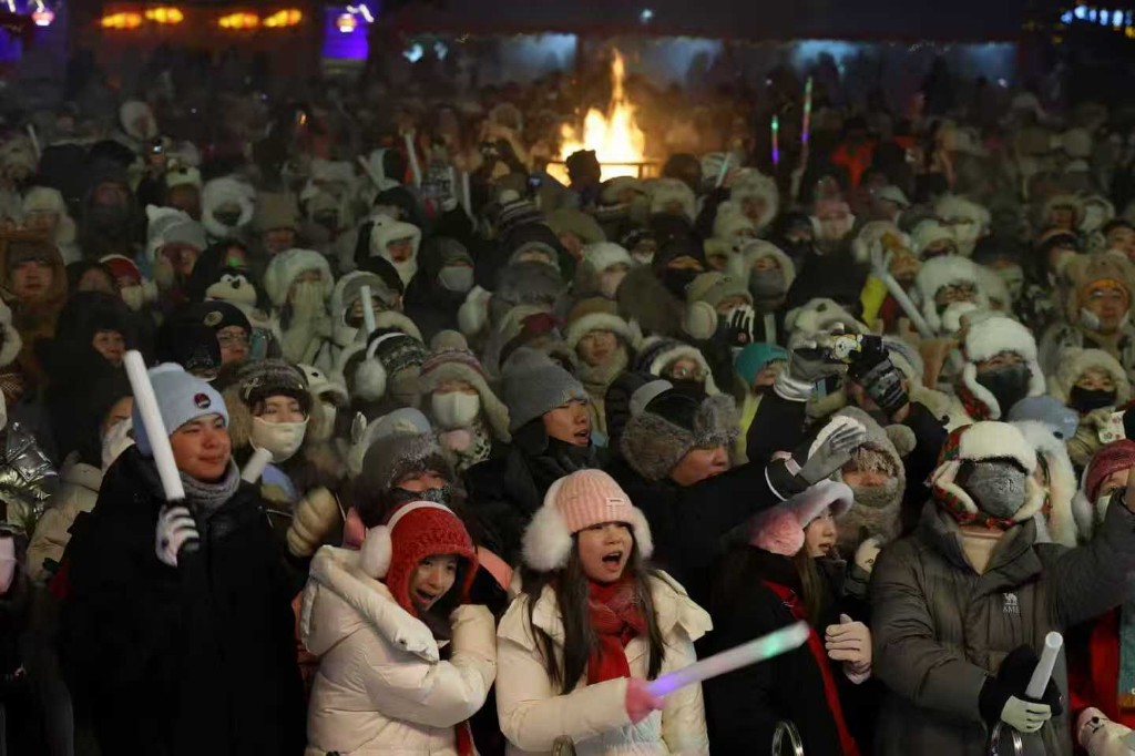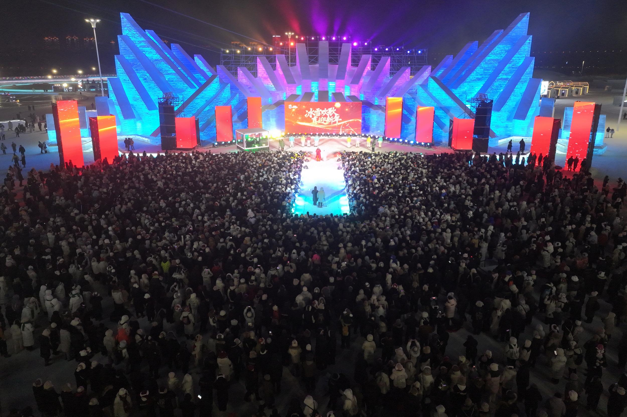 哈尔滨冰雪大世界梦想大舞台前人头攒动