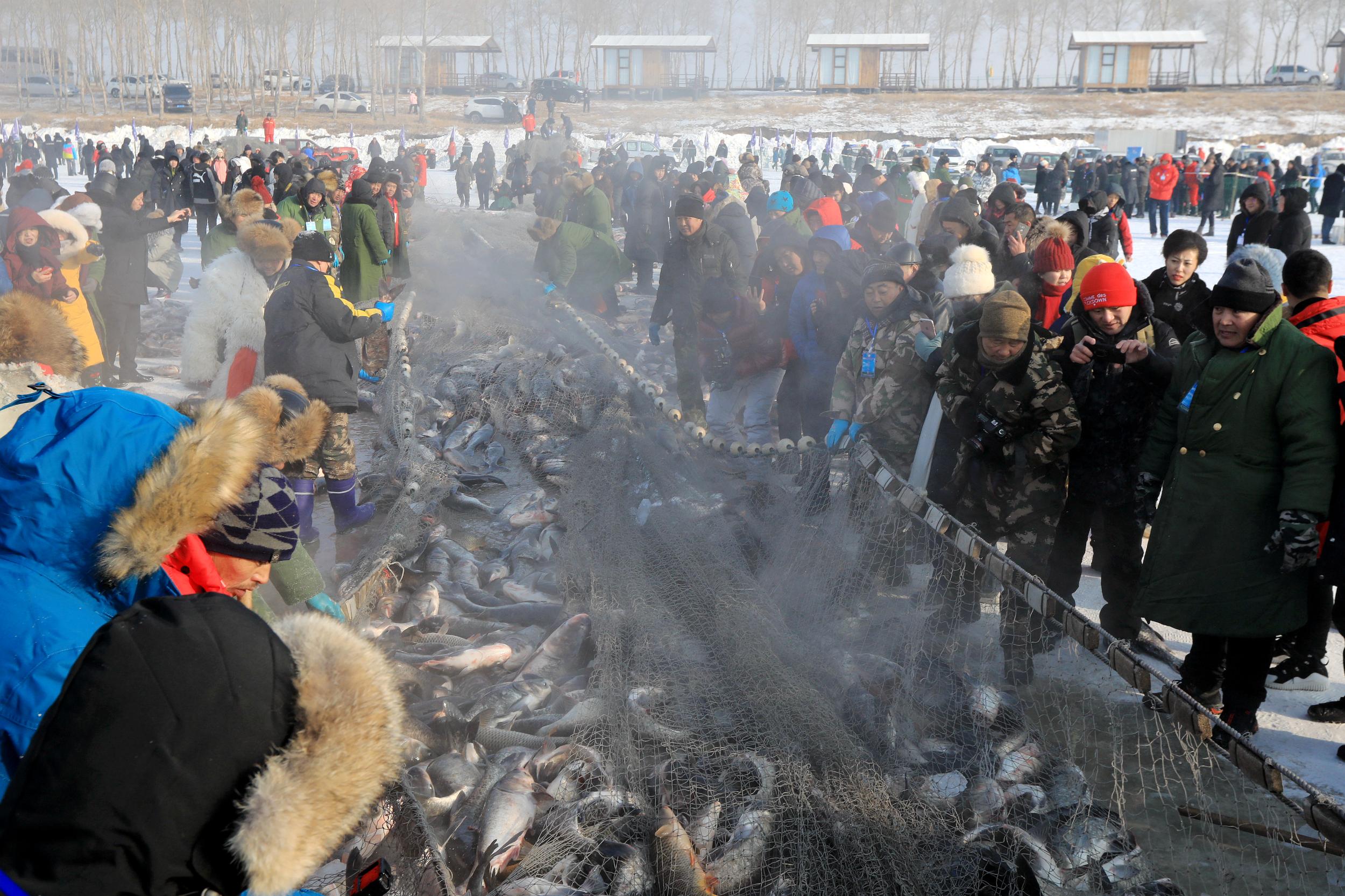 游客们近距离感受冬捕