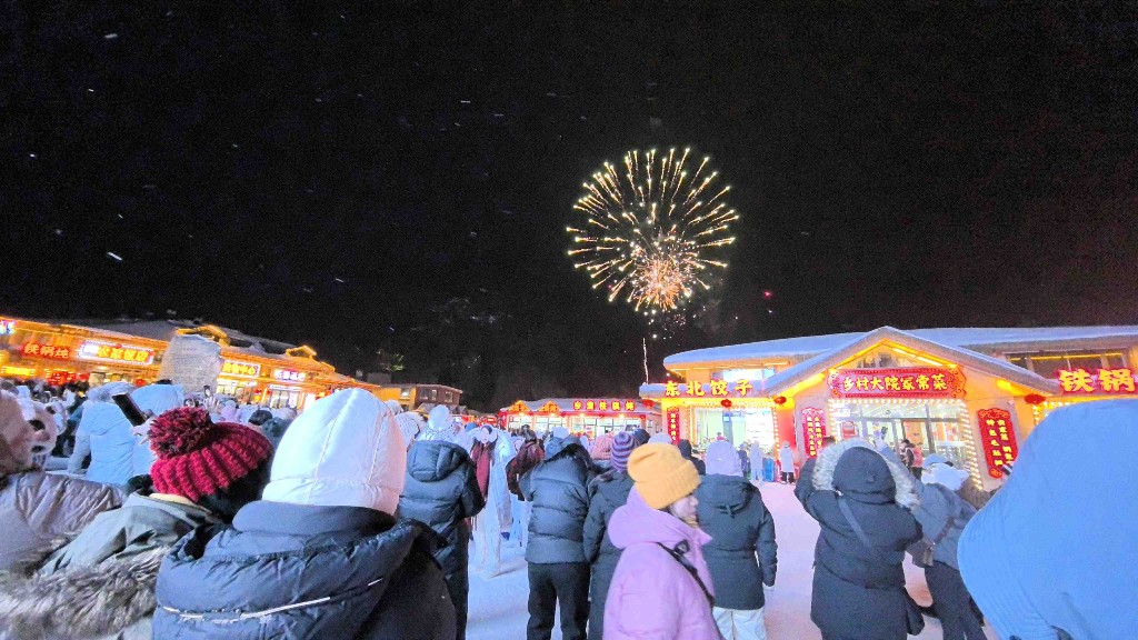 游客们在中国雪乡景区观看烟花