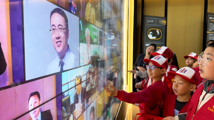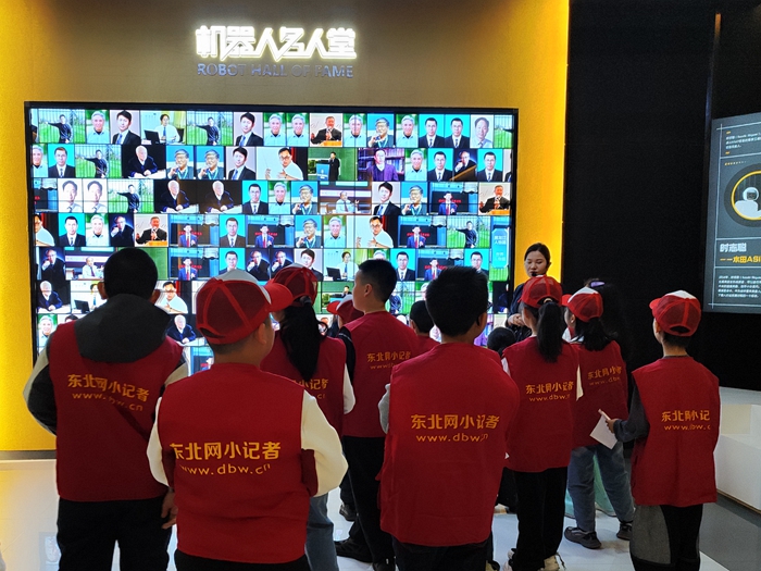 在庄重的机器人名人堂,一面巨大的屏幕占据了整面墙壁,上面是一幅汇聚了古今中外对机器人发展作出卓越贡献的名人照片墙。小记者们放轻脚步,目光被这张跨越时空的“群星图谱”深深吸引。他们仰头寻找着熟悉的面孔,有人伸出手指,轻轻点了一下中国机器人事业开拓者蒋新松院士的照片——屏幕瞬间切换,蒋新松院士的简介和他带领团队研制出我国第一台工业机器人、为中国机器人事业奠基的卓越成果清晰呈现。孩子们围上前去,认真阅读着这位科学家的生平事迹,透过指尖与先辈“对话”。