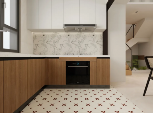 开放式厨房的设计中,防溅墙既是阻隔油污的功能屏障,更是彰显空间颜值的关键。马可波罗的“花间轻吟”花砖,铃兰、百合与飞燕在瓷面上轻盈共舞,流畅线条勾勒出灵动画卷,先进数码喷墨技术精准还原花瓣的细腻纹理,亮光墨水与精雕釉赋予表面莹润光泽,油污一擦即净的同时,更似一扇通往花海的窗。遵循竖铺指引将AB片按花朵朝上的方式铺贴,花枝纵向延伸的生命力与灶台的烟火气相映成趣,让烹饪时光也浸润在自然诗意中。