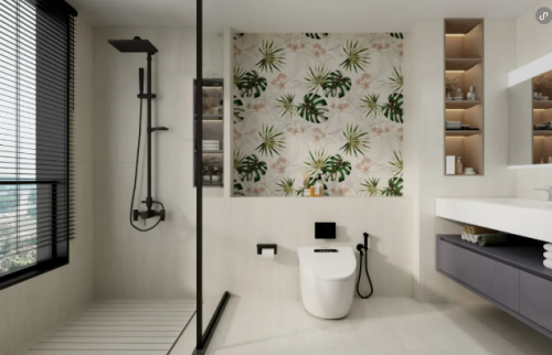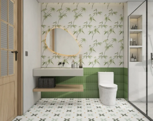 卫生间的干湿分区设计对瓷砖的质感与适配性有着严苛要求,“竹意萌趣”花砖为此提供了理想方案。清新翠竹纹理经由精雕工艺呈现,竖铺时完美展现竹子修长挺拔的姿态,干湿区均可使用的特性适配卫生间全场景。而“林间风吟”花砖则以枝叶、光影为元素,横铺时模拟林间开阔视野,强化图案的横向延展与韵律,将微风吹过树林的清新带入淋浴空间。两种花砖均易于搭配,让卫生间从实用空间升级为疗愈秘境。