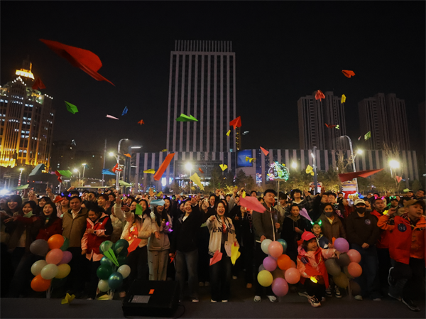 活动中,大家领取手工彩纸,写下环保心愿与对地球的祝福,折成纸飞机。伴随着《夜空中最亮的星》齐声合唱,数百架纸飞机乘风飞向夜空,承载着青年一代对绿色未来的憧憬,传递守护家园的初心。
