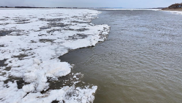 连日来,随着气温回升,江面呈现出“半江春水漾波光、半江冰封卧苍茫”的罕见景观。冰雪消融与严寒滞留在一江之上同时上演,为即将到来的开江奏响了序曲。