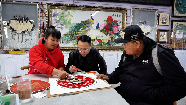 非物质文化遗产代表性传承人、民间剪纸省级代表性传承人杨双艳说:“游客来到咱们工坊,能够体验各种手工艺的制作过程。比如我手里拿着的这枚胸针,我们能为大家提供不同层次的手工 DIY 体验。要是小孩来工坊,就可以做个简单的剪贴福字;还有南方的游客、大学生也会来这里实践。就拿我手中这个福字来说,这是一位大学生体验咱们赫哲族文化时创作的。他把南方的掐丝工艺与鱼皮相结合,将两样非遗技艺融合在一起,是不是很漂亮?所以,我们的地方工艺需要更多人来实践。咱们工坊能提供几百种量身定制的手工 DIY 项目,无论你提出什么样的要求,都能用咱们赫哲族的手工技艺表现出来。”