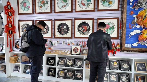 走进手工艺坊,展架上摆满了鱼皮挂件、鱼皮耳环、鱼皮胸针等手工艺品。游客汪焱鑫在展架前驻足观看,对这些鱼皮饰品很感兴趣。他平时旅游就喜欢买些小纪念品留作念想。非物质文化遗产代表性传承人杨双艳站在一旁,拿起鱼皮饰品,向他介绍鱼皮制作的过程和工艺特点。听完讲解,汪焱鑫决定亲手体验一下鱼皮制作,想自己做一件纪念品带回家。