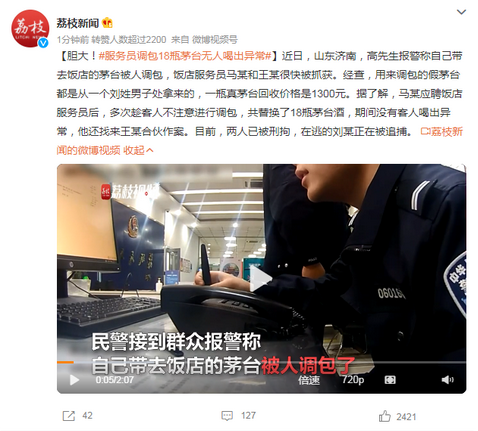 近日,山东济南,高先生报警称自己带去饭店的茅台被人调包,饭店服务员马某和王某很快被抓获。经查,用来调包的假茅台都是从一个刘姓男子处拿来的,一瓶真茅台回收价格是1300元。据了解,马某应聘饭店服务员后,多次趁客人不注意进行调包,共替换了18瓶茅台酒,期间没有客人喝出异常,他还找来王某合伙作案。