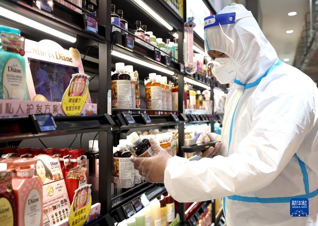 4月15日,来自武汉的何勇在上海盒马鲜生(宝地店)核对商品库存。新华社记者陈建力摄