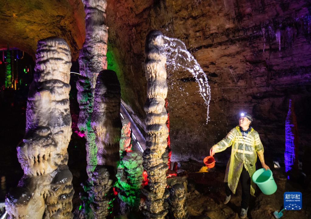 4月21日,在湖南省张家界市武陵源区黄龙洞景区,工作人员在清洁溶洞内的钟乳石。