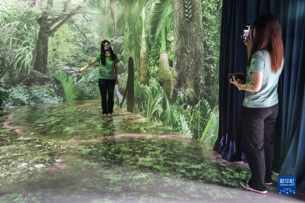 4月21日,观众在“寻觅雨林·万物共生”热带雨林文化展上拍照留念。