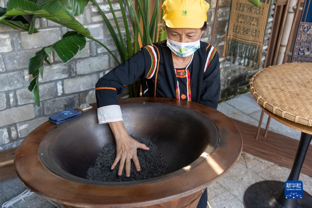 工作人员在“寻觅雨林·万物共生”热带雨林文化展上制作茶叶(4月20日摄)。
