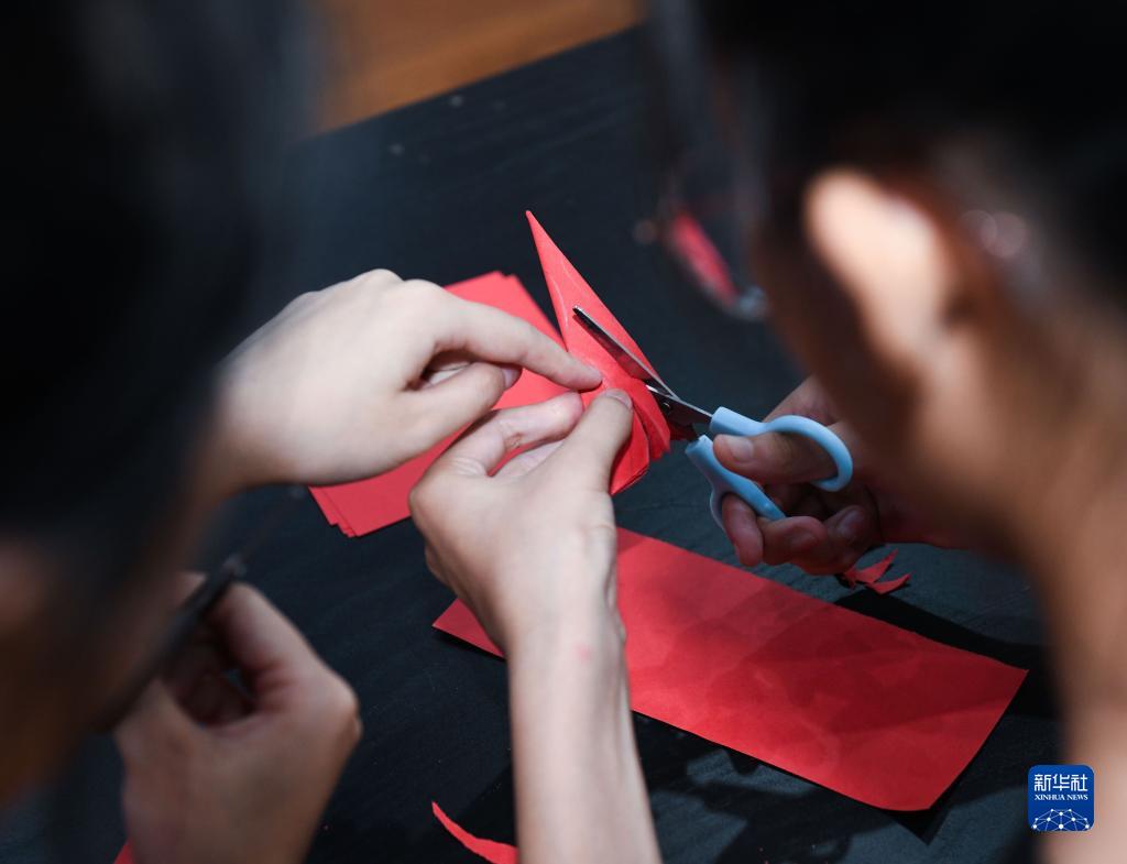 7月4日,小学生在青年志愿者的指导下学习剪纸技艺。