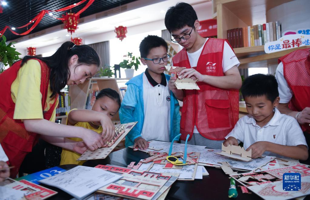 7月4日,小学生在青年志愿者的指导下搭建建筑模型。
