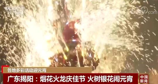 1月31日晚,国家级非遗项目——“乔林烟花火龙”表演在广东揭阳市举行,伴随着锣鼓齐鸣,舞龙健儿挺举着装满烟花的火龙。火线被点燃后,彩龙身上的烟花瞬间齐发,腾跃飞舞,场面十分壮观。