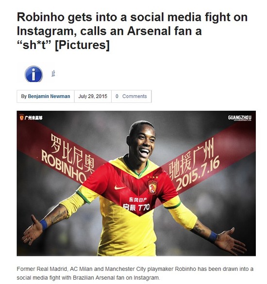 对此巴西球星显然十分愤怒,罗比尼奥在这名球迷最新状态下面进行了愤怒的回应,“不要再说这种垃圾话了!You S**t!”,而这则最新状态正是这名球迷穿着枪手的球衣在酋长球场的照片,可见这是一名巴西的枪迷。身在中国的罗比尼奥与远在巴西的枪手球迷展开了一场“隔空对骂”,这些骂战的内容再巴西社交媒体上也被疯狂转载。
